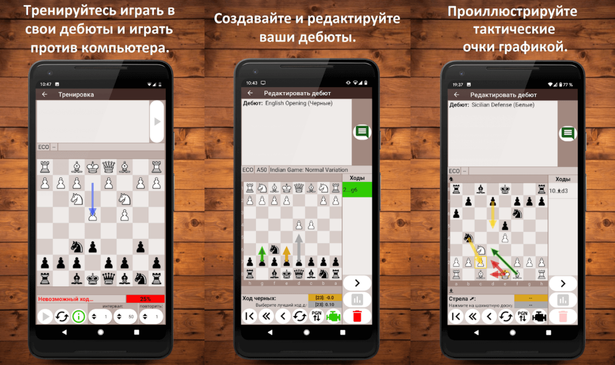 Первое из таких приложений — Chess Openings Trainer. Если хотите поработать над своими дебютами и поздней игрой — вам сюда. Поскольку это приложение-самоучитель, вашей основной целью будет учиться и запоминать, ведь повторение — мать учения, особенно в шахматах.