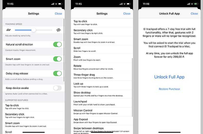После первого запуска приложения на iPhone активируется 7-дневная пробная версия со всеми доступными возможностями. Через неделю программа перестанет распознавать мультитач жесты и потеряет большую часть своих возможностей.