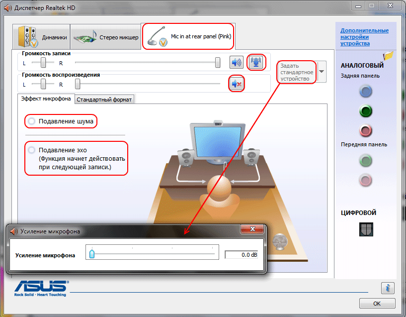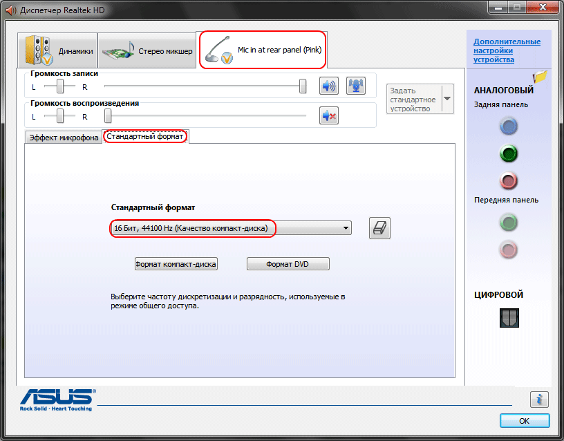 Итак, ставим громкость записи на максимум, а усиление микрофона выключаем (потом, если понадобится, можно включить). Также, очень часто люди жалуются, что у них воспроизводится звук воспринимаемый микрофоном, чтобы этого не было — отключаем воспроизведение. На свой вкус — фильтрация шума, подавление эхо. На вкладке «Стандартный формат», опять же, задается формат записи: