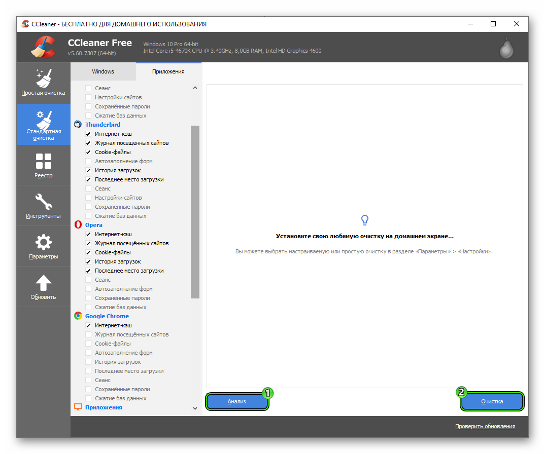 И начнем эту процедуру с раздела «Стандартная чистка» в левом меню утилиты. Он содержит в себе две отдельные вкладки: Windows и Приложения. Первая включает в себя весь системный софт и соответствующие параметры, вторая – сторонние программы.