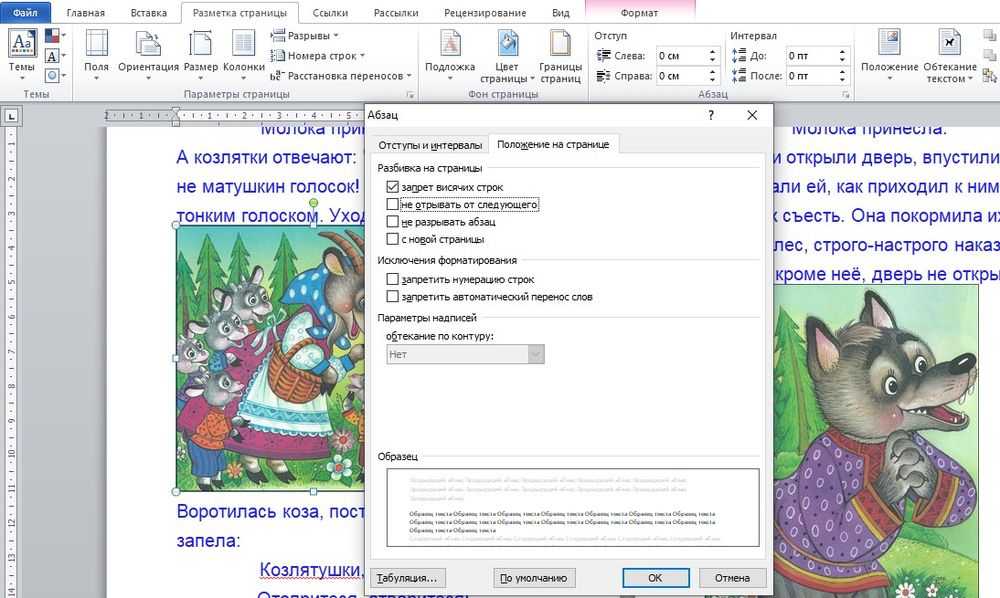 По желанию пользователь может сделать стандартное форматирование текста: выравнивание по ширине, отступ первой строки, уменьшение/увеличение полей, удаление лишних строк. Чтобы подзаголовки не располагались раздельно с текстом, в «Разметке страницы» вызвать опцию «Абзац». Откроется окно, где во вкладке «Положение на странице» поставить галочку в поле «Не отрывать от следующей».