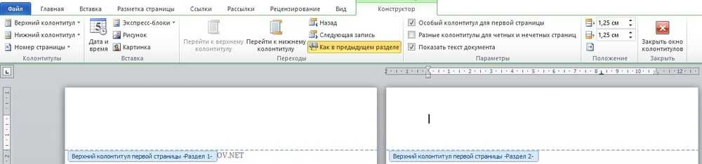 - По умолчанию Word устанавливает связь между разделами. Убрать галочку с пункта «Особый колонтитул для первой страницы» и сделать неактивным пункт «Как в предыдущем разделе», клацнув по нему.