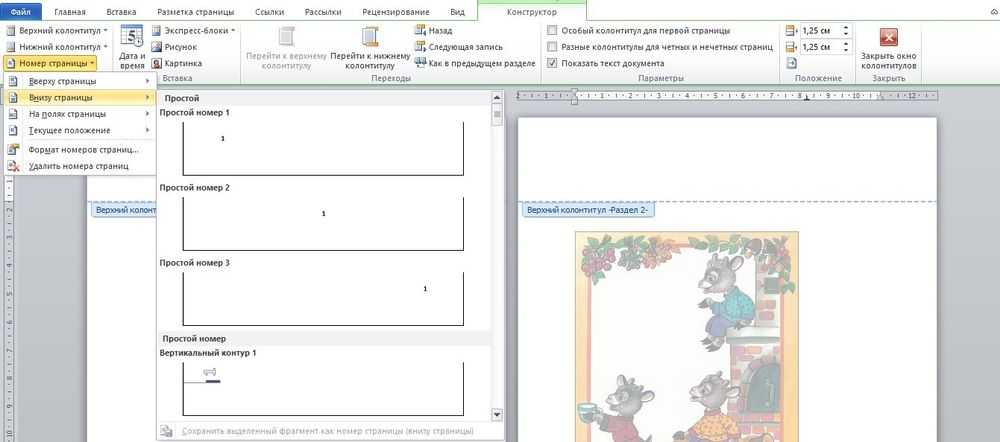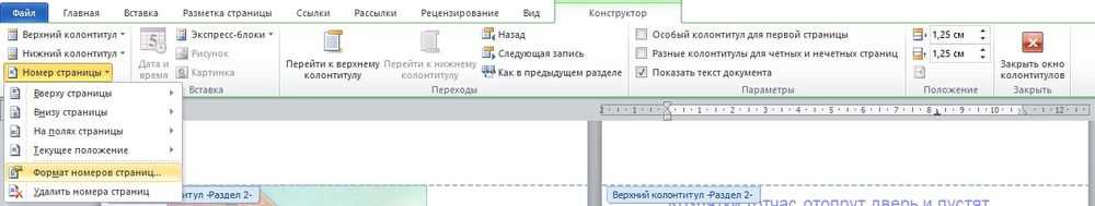 Дважды щелкнуть правой кнопкой мышки сверху или снизу листа для открытия меню. Активируется раздел «Конструктор». Здесь расположены кнопки для перехода к верхнему/нижнему колонтитулу, изменения полей и т.д.