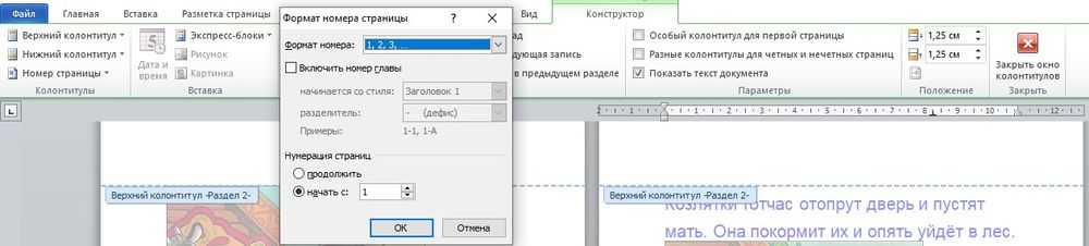 - Проверить расстановку цифр. Мастер может автоматически поставить связь между разделами, поэтому снова сделать неактивным пункт «Как в предыдущем разделе» и убрать цифры из колонтитулов там, где они не должны быть. С помощью формата номеров задать цифру, с которой начнется отсчет.