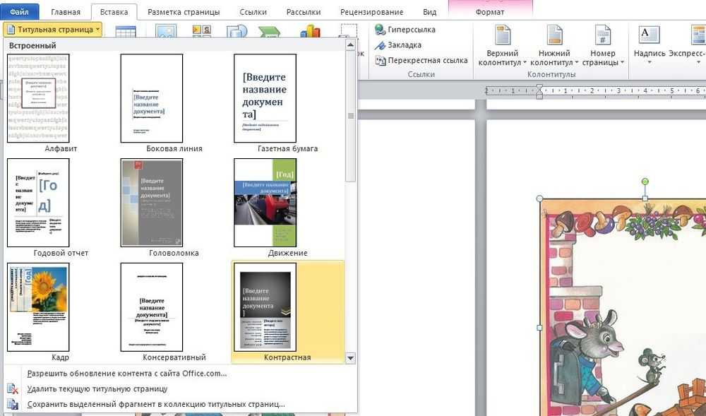 Теперь перейти в раздел «Вставка». Слева на панели настроек найти параметр «Титульная страница» и клацнуть по нему. Отобразится список с вариантами обложки. Выбрать наиболее подходящий.