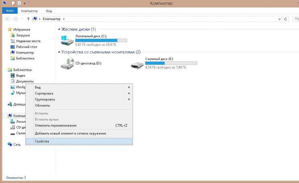 Вызвать правой кнопкой мыши выпадающее меню окна «Компьютер» и в нем нажать на подпункт «Свойства».