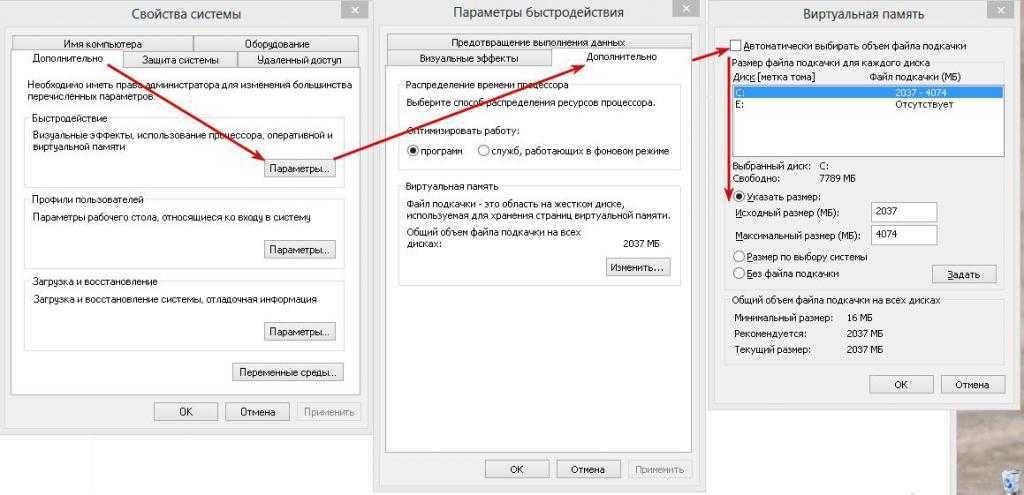 Затем во вкладке «Дополнительно» откройте параметры быстродействия. Затем нажмите кнопку «Изменить» для редактирования параметров виртуальной памяти (см. скрин ниже со стрелками и цифрами по порядку).