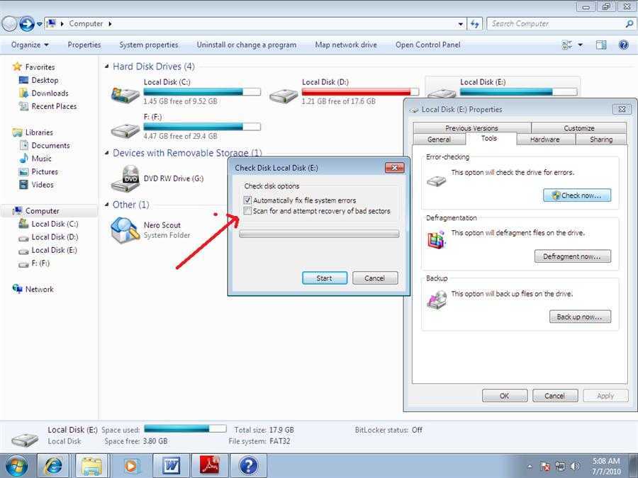 Чтобы «отремонтировать» поврежденные участки, нужно воспользоваться встроенной утилитой CheckDisk. Ее можно запустить при помощи командной строки или графического интерфейса. Использование последнего заключается в следующем: