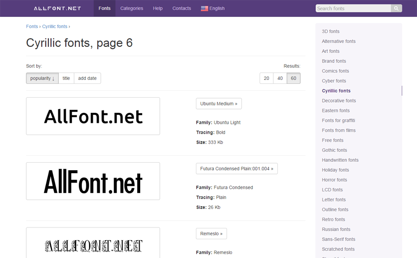 Стили это еще один удобный способ найти бесплатные шрифты. Здесь находятся все категории, такие как модные шрифты, экстремальные шрифты, старые стили шрифтов, известные шрифты и т. Д.