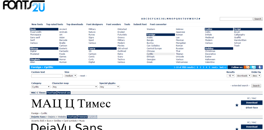 Около 70 страниц всевозможных шрифтов ждут вас на сайте Fonts2U.com. Скачать понравившийся вариант можно в формате .ttf. Есть возможность просмотреть примеры для кириллицы и латиницы.