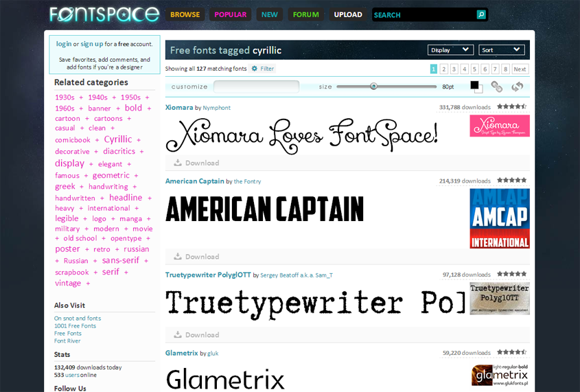 FontSpace также имеет меню NEW в верхней части веб-сайта, чтобы увидеть 1000 последних добавленных шрифтов, и кнопку RANDOM , чтобы показать вам 10 совершенно случайных шрифтов, которые вам могут понравиться. ,