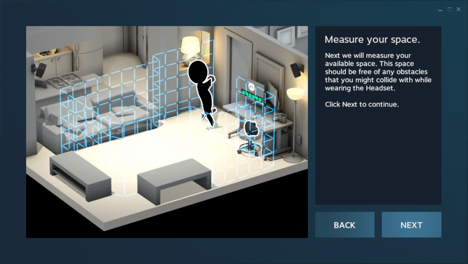 По завершении установки всего софта, программа спрашивает, как я буду использовать Vive – сидя/стоя или по всей комнате (для этого требуется пространство минимум 2х1,5 м). Я выбрал последний вариант и программа попросила очертить границы свободного места с помощью одного из контроллеров. И снова у меня не сразу получилось доказать, что места достаточно (такая же проблема возникала с Vive Pre), но небольшая перестановка помогла справиться с задачей. Предупреждение: если вы хотите сделать игровой площадкой большую комнату, учтите, что разделять базовые станции можно максимум на 5 метров, хоть я и видел, как некоторые разработчики демонстрировали настройку Vive для больших помещений.