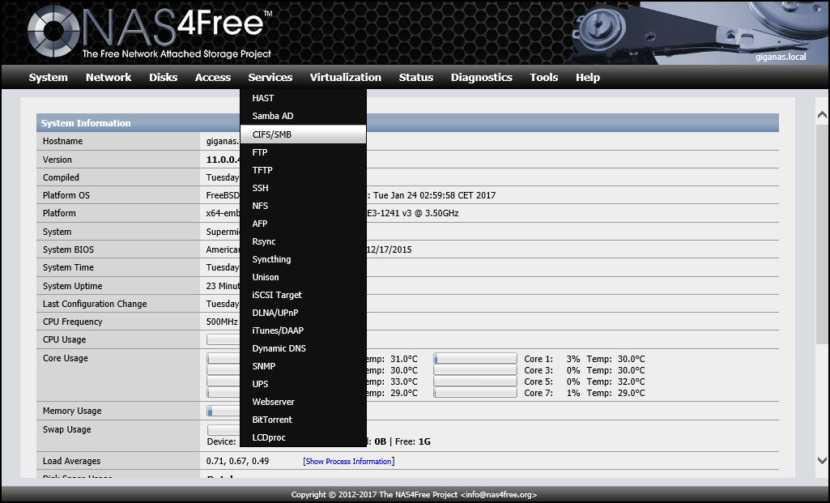 NAS4Free поддерживает совместное использование в Windows, Apple и UNIX-подобных системах. Он включает ZFS v5000, программный RAID (0,1,5), шифрование диска, отчеты SMART / электронной почты и т. Д. Со следующими протоколами: CIFS / SMB (Samba), контроллер домена Active Directory (Samba), FTP, NFS, TFTP, AFP, RSYNC, Unison, iSCSI (инициатор и цель), HAST, CARP, Bridge, UPnP и Bittorent, которые легко настраиваются через веб-интерфейс. NAS4Free можно установить на Compact Flash / USB / SSD ключ, жесткий диск или загрузить с LiveCD / LiveUSB с небольшим usbkey для хранения конфигурации.