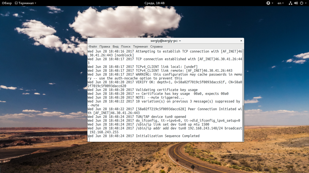 После этого окно терминала закрывать нельзя и если OpenVPN сервер был настроен правильно, то он уже передал на машину правильные маршруты и ваш трафик идет через виртуальную сеть. Давайте посмотрим маршруты: