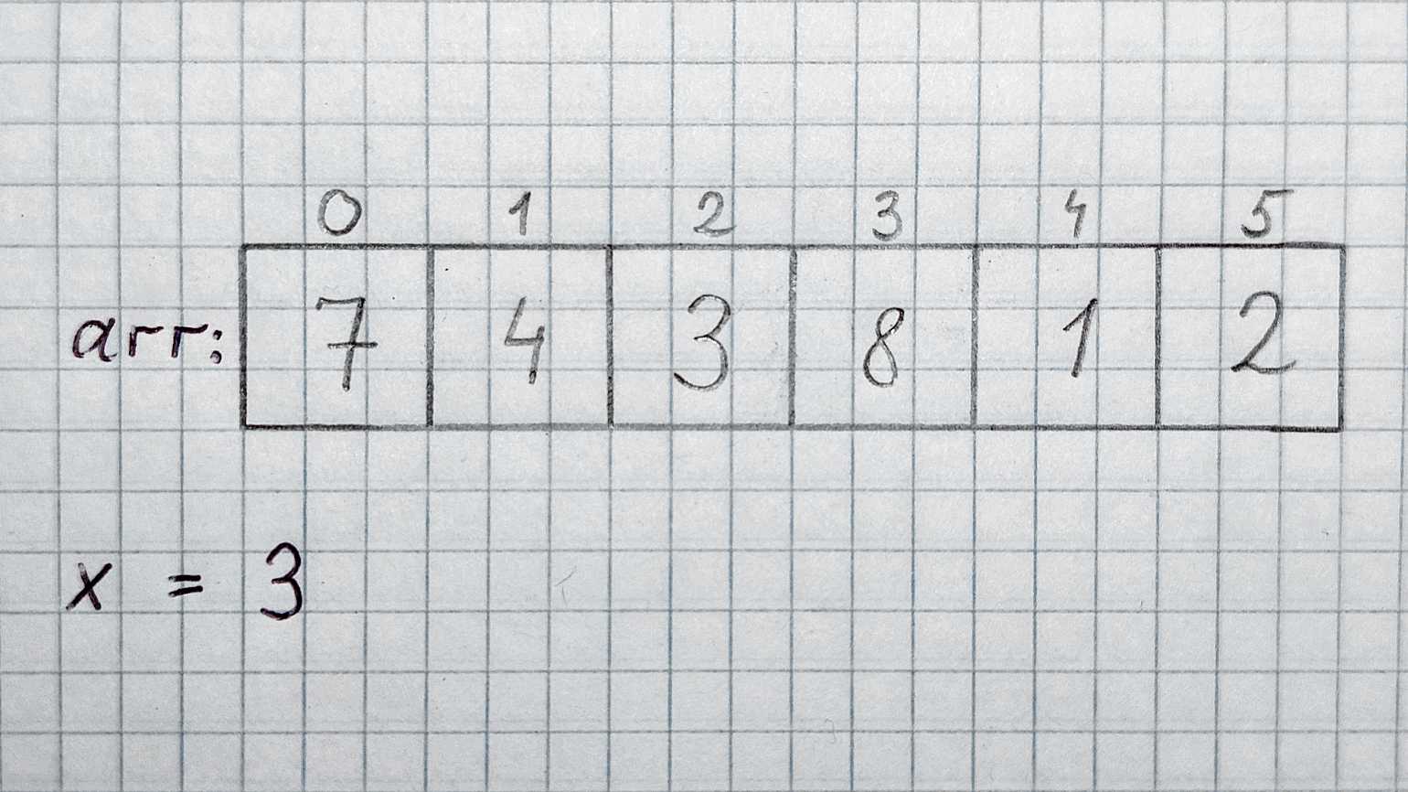 Допустим, у нас есть массив целых чисел arr, содержащий n элементов. Вообще, количество элементов, размер строк, массивов, списков и графов в алгоритмах всегда обозначают буквой n или N. Ещё дано целое число x. Для удобства обусловимся, что arr точно содержит x.
