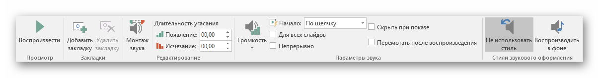 - «Стили звукового оформления» — это две отдельные кнопки, которые позволяют либо оставить звук так, как он вставлен («Не использовать стиль»), либо автоматически переформатировать его в качестве фоновой музыки («Воспроизводить в фоне»).