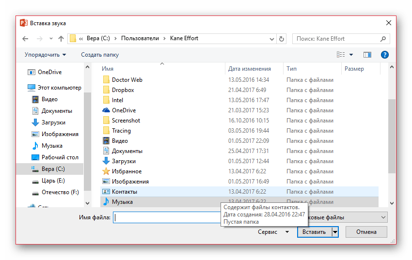 Убедитесь, что ваша презентация и все звуковые или музыкальные файлы, которые вы хотите воспроизвести в презентации, перемещаются или копируются в эту папку. Все звуковые или музыкальные файлы должны находиться в этой папке предшествующий для вставки музыкального файла в презентацию, или процесс может не работать.