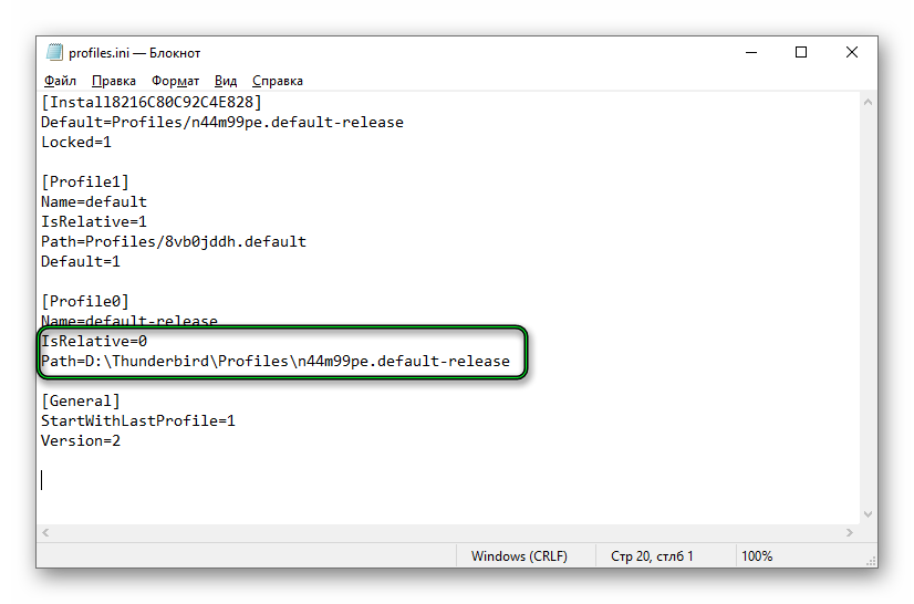 - В старой директории откройте файл profiles.ini в любом текстовом редакторе, например, во встроенном Блокноте.