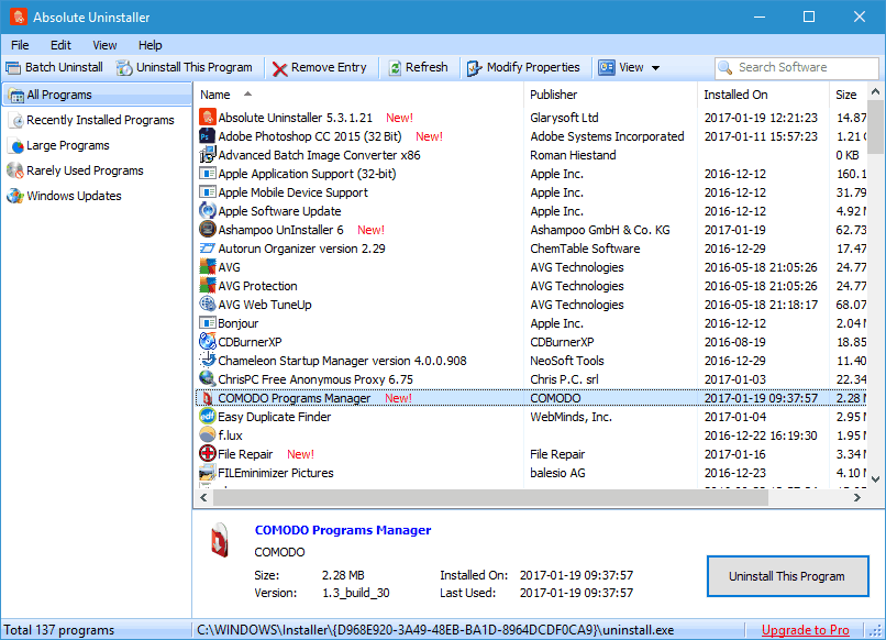 Absolute Uninstaller — это небольшое и простое приложение, которое поможет вам удалить упрямое программное обеспечение. Приложение поставляется с простым пользовательским интерфейсом, и вы можете искать нужное приложение, используя панель поиска в верхнем правом углу. Этот инструмент также позволяет сортировать файлы, чтобы быстрее находить приложения. Вы можете отображать только недавно установленные приложения или только большие программы, чтобы найти приложения, которые занимают больше всего места. При желании вы также можете отображать редко используемые программы и легко удалять старые приложения, которые вы больше не используете.
