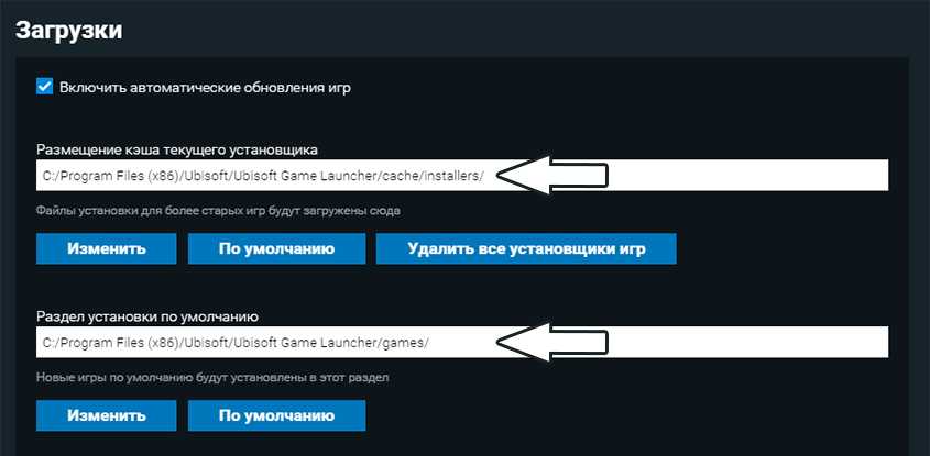 «Размещение кэша текущего установщика» подразумевает папку для скачки и хранения файлов установщиков игр. Поменяйте расположение папки, например, на D:/Ubisoft-installers/ , если в системе несколько логических дисков. Главное требование — расположение находится вне системной папки, чтобы не возникало проблем с правами при сохранении файлов, и много свободного пространства. Нажмите «Изменить» и выберите желаемую папку.