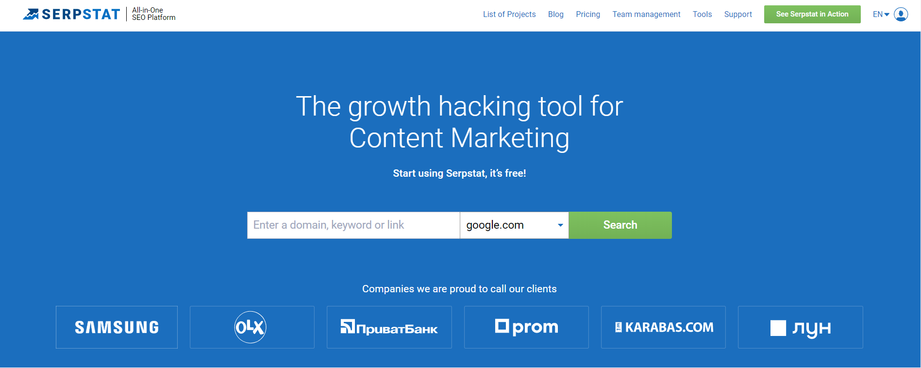 Многофункциональная SEO-платформа Serpstat позволяет анализировать ключевые слова, платную выдачу, сайты конкурентов, предоставляет инструменты для поисковой аналитики, мониторинга позиций, исследований рынка, проведения аудита сайта, дает возможность создавать идеи для контента. Начинать работу с системой можно после регистрации. Стоимость базового функционала от 69$/мес. По промокоду wordfactory вы сможете использовать Serpstat бесплатно 5 дней.