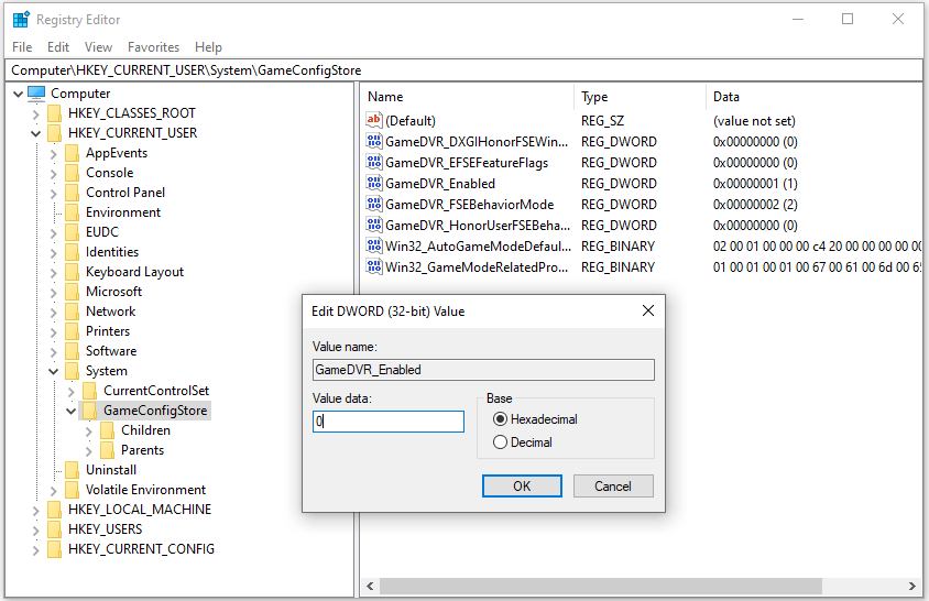 Step 6. Move to HKEY_CURRENT_USERSystemGameConfigStore and change the value of GameDVR_Enabled to “0”.