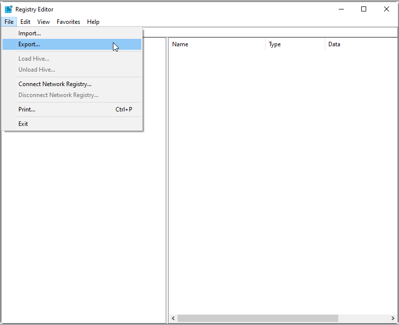 Step 3. Click on the File on the top menu and select Export to export an original version of the registry settings. This is the step to make a backup of registry file.