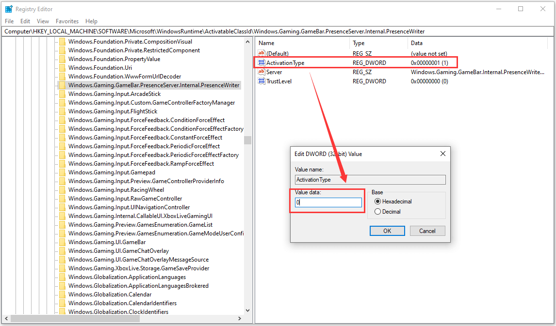 Step 3. Go back to the Windows.Gaming.GameBar.PresenceServer.Internal.PresenceWriter folder in Registry Editor, find the ActivationType file and set its value data to “0”.