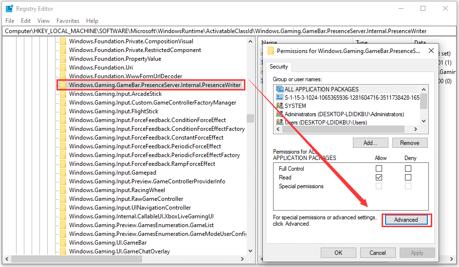 Step 2. Right click on the Windows.Gaming.GameBar.PresenceServer.Internal.PresenceWriter folder and select Permissions. Then, just click Advanced to change the owner from TrustedInstaller to your username and assign full control to your username following the tutorials in above solution 3.