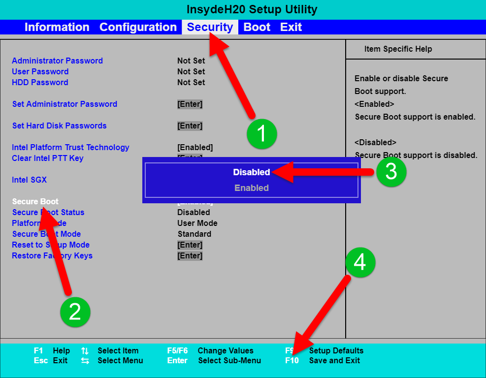 - Security Boot — disabled (отключаем защищенную загрузку).