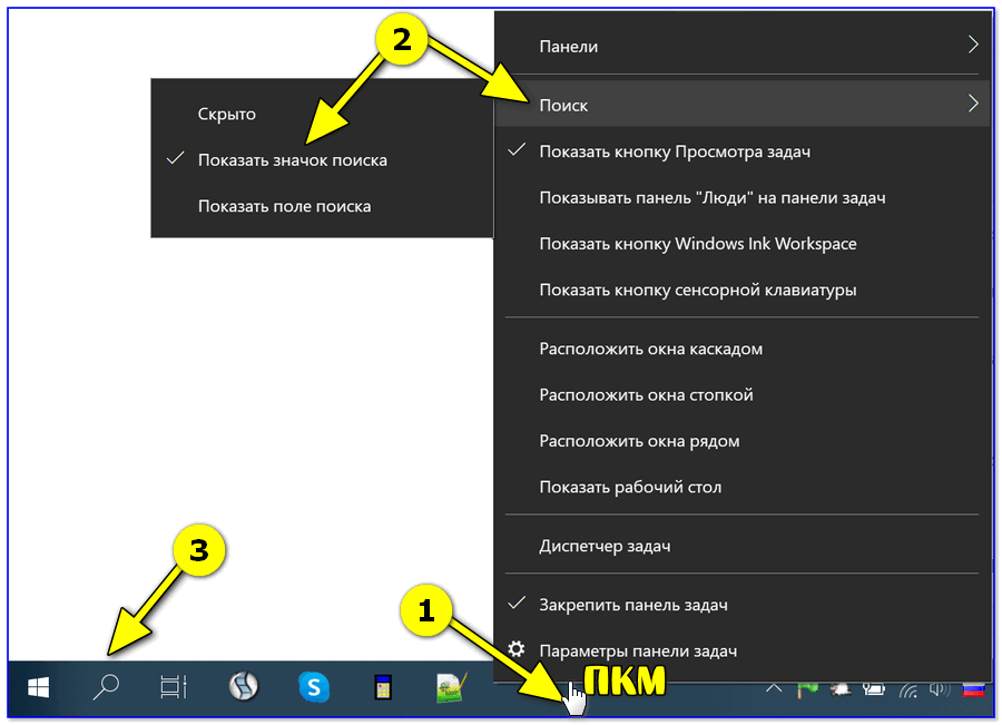 Если значок “Лупы” (или поисковой строки) вовсе не отображается на панели задач — нажмите по ней в свободном месте от иконок правой кнопкой мыши, и в появившемся меню раскройте вкладку “Поиск” — поставьте галочку рядом с “Показать значок поиска” .