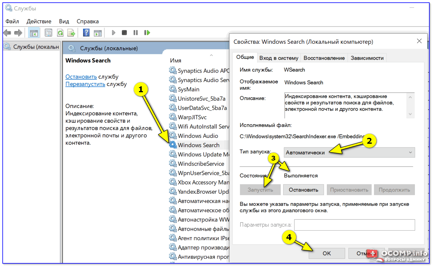 В списке служб найдите Windows Search и откройте ее. Во вкладке “Общие” у службы должен стоять автоматический тип запуска, состояние — “Выполняется” . Если это не так — исправьте настройки (как нужно сделать – показано на скрине ниже) .