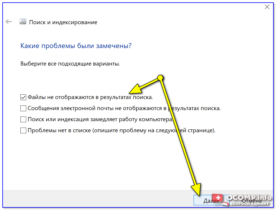 Следом отметить галочками проблему (например, “Файлы не отображаются в результатах поиска”) и нажать по кнопке “далее” . Мастер проверит вашу систему на проблемы и ошибки, и, если они будут найдены — устранит их!
