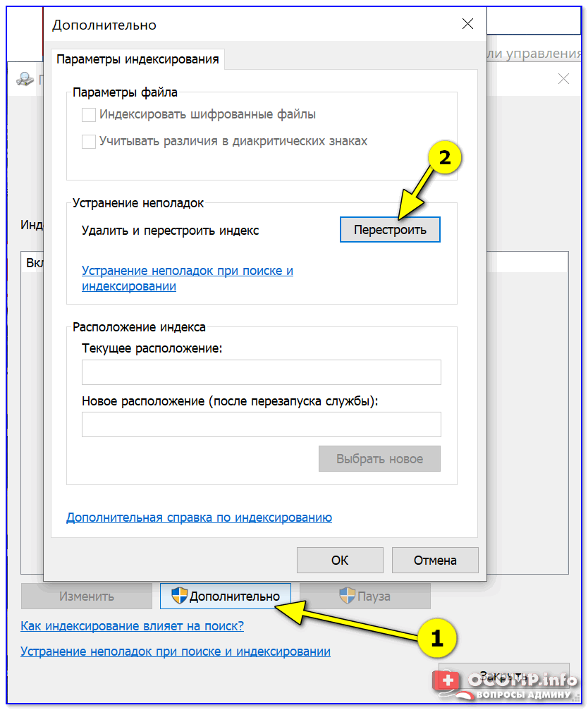3.. Пуск —> Панель управления —> Параметры индексирования —> Дополнительно —> Перестроить. Проверяем, если не помогло: