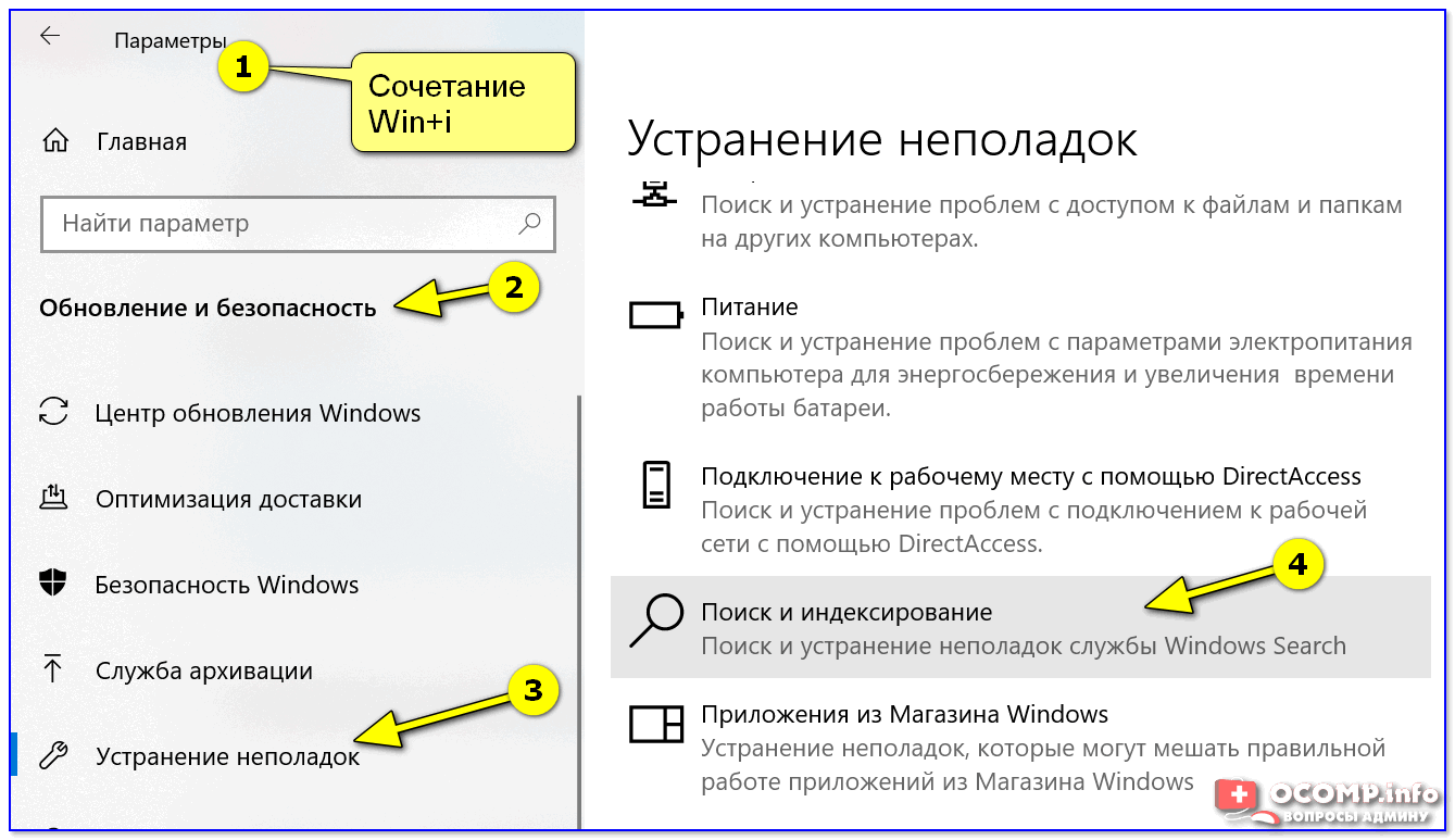 Чтобы его запустить — необходимо открыть параметры Windows (сочетание клавиш Win+i), перейти во вкладку “Обновление и безопасность / устранение неполадок” и кликнуть по инструменту “Поиск и индексирование” .