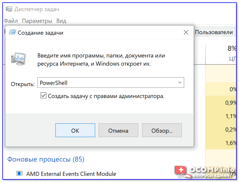 Можно попробовать перерегистрировать кнопку ПУСК и панель задач (т.е. откатить их к исходным настройкам) с помощью спец. команды в оболочке PowerShell. Запустить ее нужно от имени администратора: для этого откройте диспетчер задач и воспользуйтесь меню “Файл/новая задача” . См. скриншот ниже.