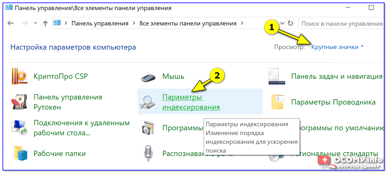 Делается это достаточно просто: сначала нужно открыть панель управления, переключить отображение на “Крупные значки” и перейти во вкладку “Параметры индексирования” .