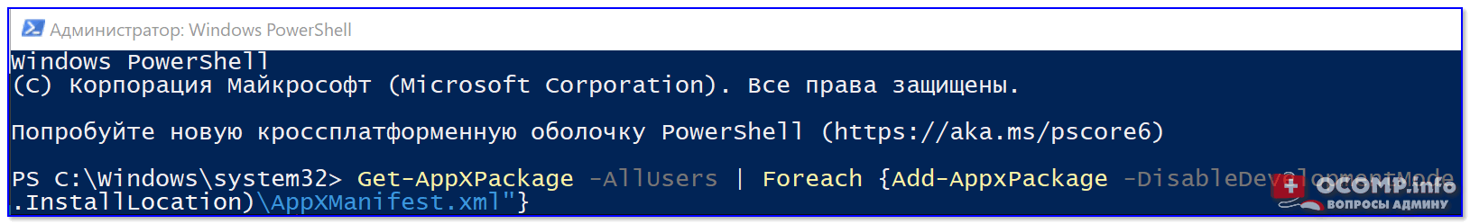 В запущенной оболочке Windows PowerShell (от имени администратора) выполните команду: Get-AppXPackage -AllUsers | Foreach {Add-AppxPackage -DisableDevelopmentMode -Register “$($_.InstallLocation)\AppXManifest.xml”}. Это касается всех стандартных приложений.