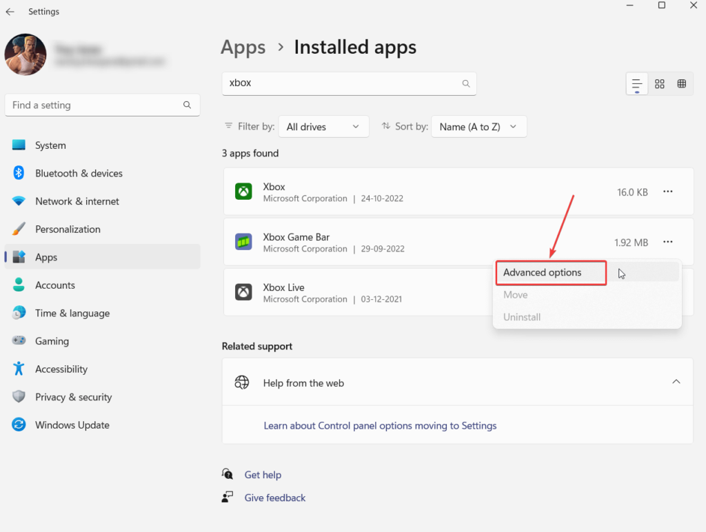 В строке поиска введите Xbox а затем нажмите на три точки рядом с Игровая панель Xbox имя. 5. Нажмите Расширенные опции .
