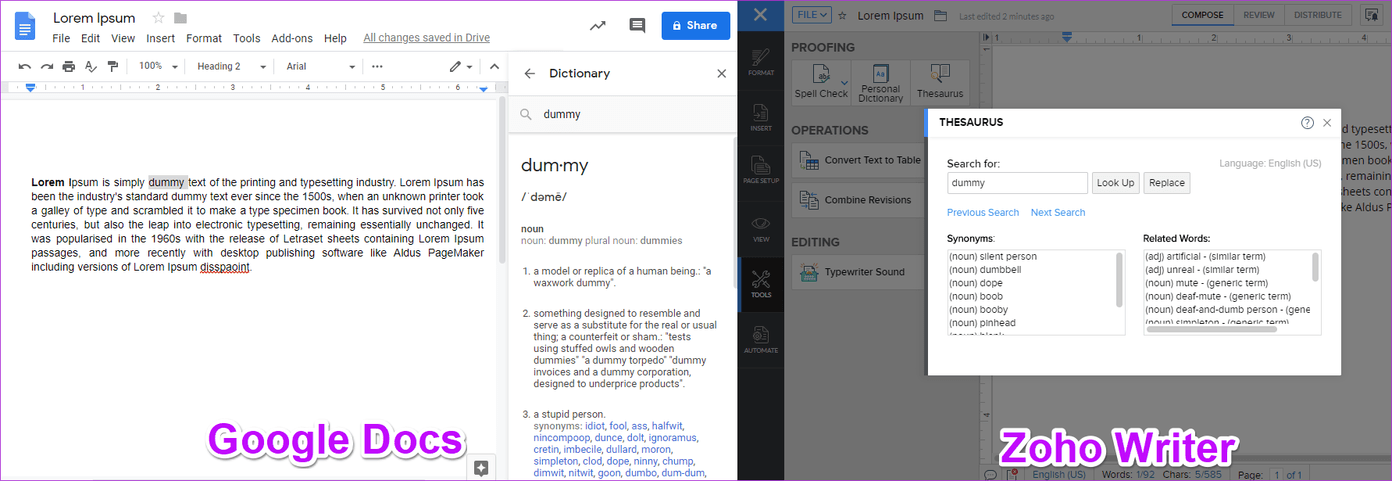 Кроме того, тезаурус находится на расстоянии одного клика. Если вас беспокоит истинное значение слова, вы всегда можете вызвать словарь. Оба приложения предлагают словарь для той же цели, за исключением того, что Zoho также показывает вам связанные слова вместе с синонимами.