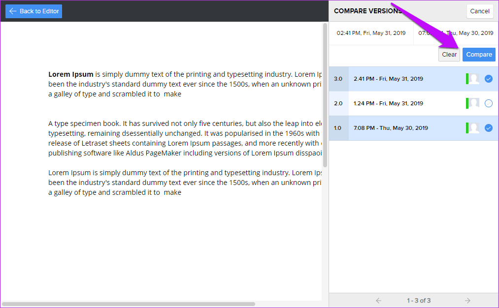 В то время как и Google Docs, и Zoho Writer сохраняют версию вашей работы, Writer продлевает время и позволяет сравнивать две версии. Все, что вам нужно сделать, это нажать Файл> История документа и нажать Сравнить версию.