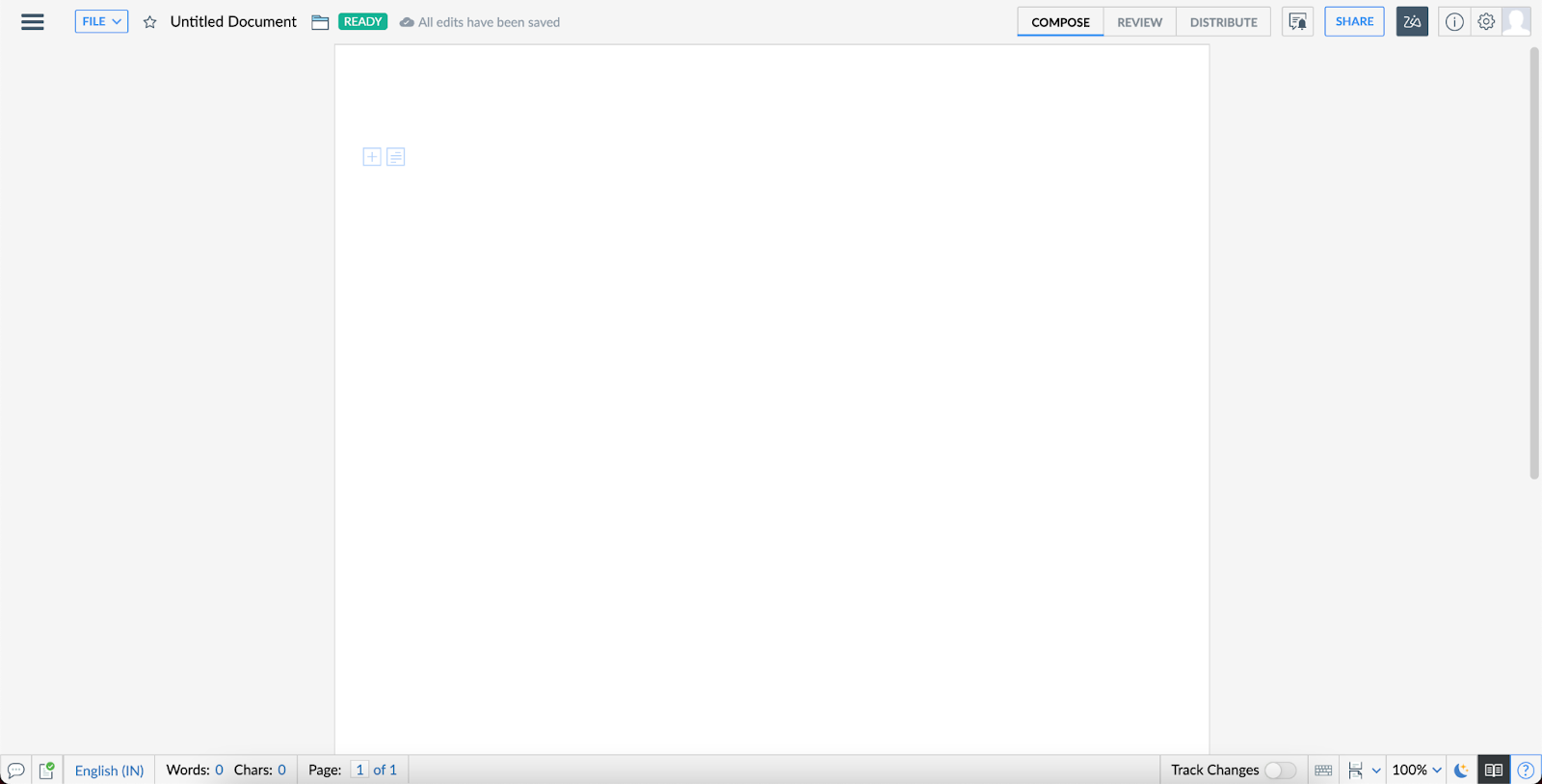The header is immediately familiar to any Google Docs user. Here, you can title your document, favorite it and check on its save state. The right-hand side of the header menu gives you access to sharing options, a settings menu, your Zoho profile and document properties. The header also contains three tabs for switching your workspace into different modes. Compose is your primary setup for writing your document. Review is a collaboration-focused workspace that allows you to review comments and changes. Finally, Distribute is a workspace that adds a simple toolbar for publishing and printing your finalized work.
