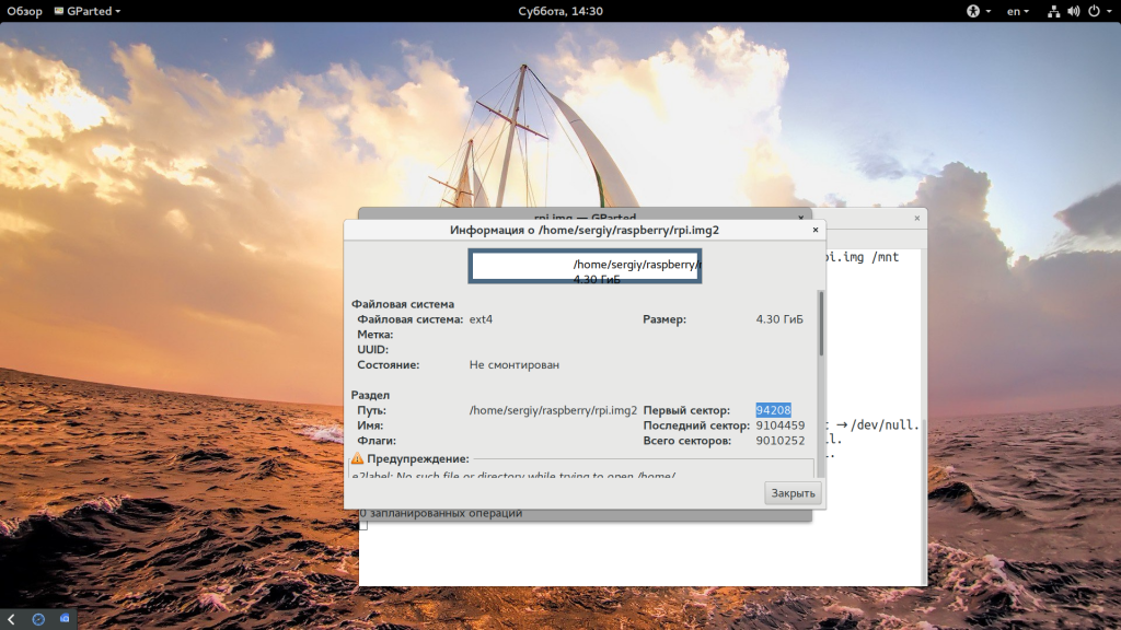 Наш образ просто так не загрузиться, и нам нужно его еще немного подправить. Нужно примонтировать корневую файловую систему образа, но это не так просто. Поскольку это образ диска, а не раздела и на нем есть своя файловая система то мы не можем его просто так примонтировать. Откройте файл в gparted: