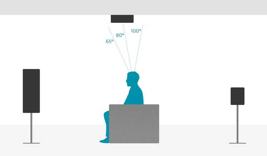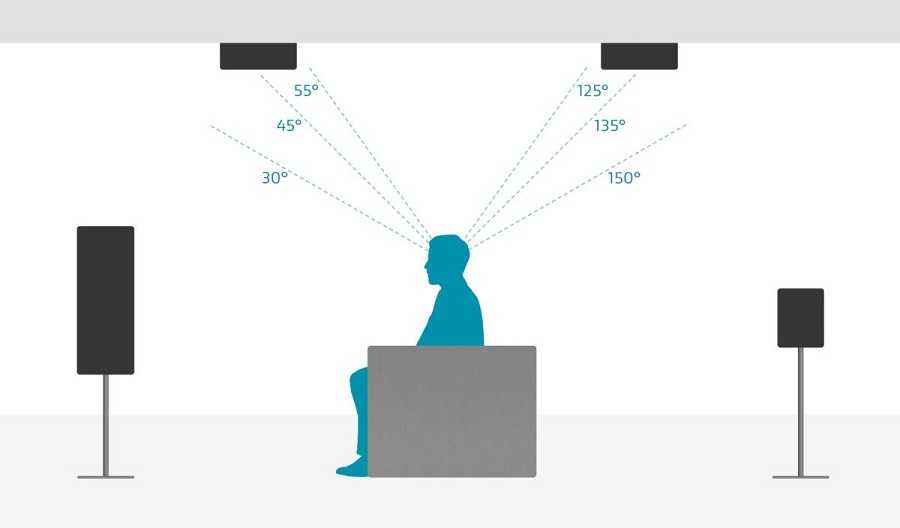 С классической схемой 5.1 все понятно — если вы собираетесь смотреть фильмы на диване, то фронты находятся впереди вас, тылы позади зрительских мест, а центр, собственно, по центру перед вами. Куда же крепить верхние каналы, к потолку? Если у вас система с двумя «верхами», то их нужно размещать впереди, или позади зрительского места в диапазоне 60-100 градусов относительно плоскости пола. Если «потолочных» спикеров четыре, то нужно совсем другое размещение. Верхние фронты и тылы лучше размещать в диапазоне 35-55 градусов впереди и сзади зрительского места.