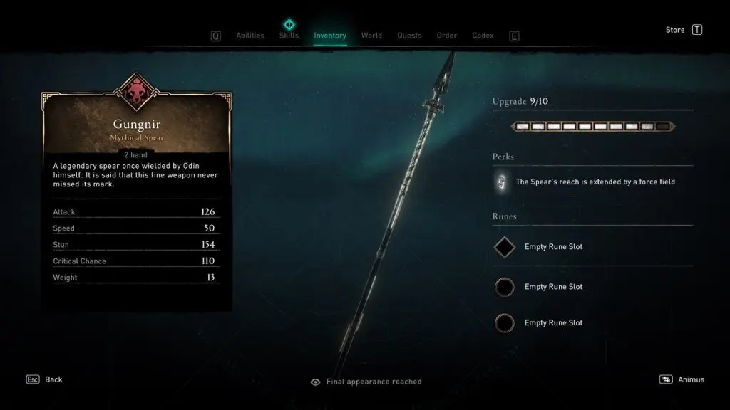 Мощные копья часто встречаются в историях и историях, и AC: Valhalla ничем не отличается. Гунгнир имеет те же легендарные характеристики, но сочетает их с силовым полем расширения. Хотя лично я считаю, что расширенное поле стрелы копья выглядит более чем глупо, преимущество в игровом процессе, которое такая нелепая дальность действия дает вам, не сводя на нет вашу способность наносить урон на среднем / ближнем расстоянии, очень важно. Спрятанное в районе Hordafylke, доступное после миссии Brother’s Keeper, копье не так уж сложно схватить, оно просто очень, очень далеко, в левом коридоре в пещере рядом с финальной миссией. Просто сорвите его со стены, и копье Одина ваше