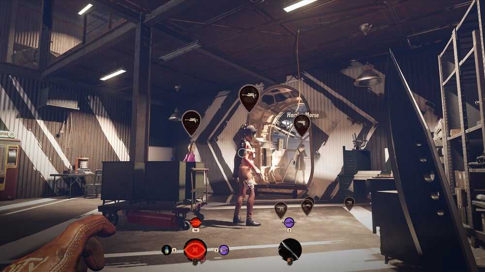 В заключение этого пункта отметим, что для наиболее эффективного способа проходить скрытно (и не очень) игру лучше всего обзавестись оружием с глушителем. Зачастую глушитель прикреплен к оружию с фиолетовым уровнем качества, поэтому имеет смысл осматривать все трупы врагов и заглядыввать в «Зацепки», о чем мы поговорим ниже. Потому лучшее оружие в Deathloop, на наш взгляд, это пистолет-пулемет ЛИМП 10 с глушителем, которое помимо тихой стрельбы отличается скорострельностью