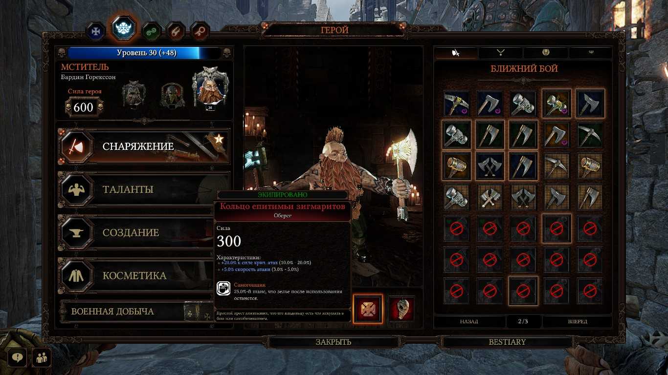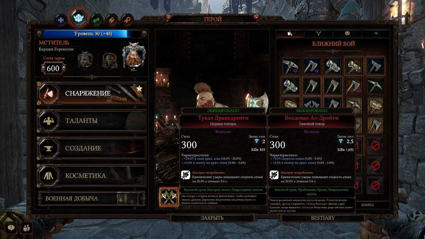На двуручном я выбрал бонусы к скорости и шанс крита, с таким же первом на ускорение от критов. Это даёт возможность быстро разбирать орды любыми атаками: быстрыми в узких проходах и заряженными на открытых пространствах. Хотя в узких проходах для орды сгодятся и два топора, это уже на ваш вкус.
