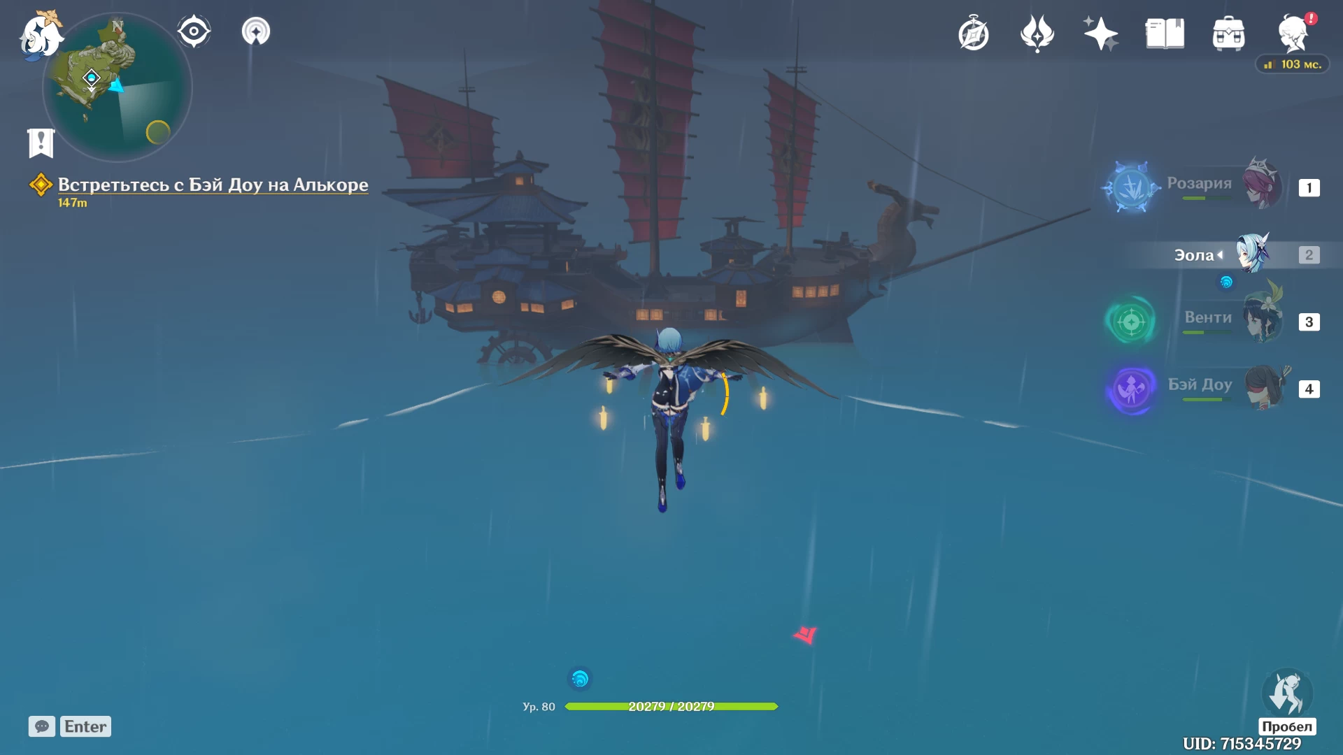 После разговора с ней идем в каменный лес Гуюнь и находим там корабль Бэй Доу. Добраться до него можно спланировав на глайдере с ближайшей скалы. Можно конечно использовать и вариант с Кэйа, но путь займет гораздо больше времени.