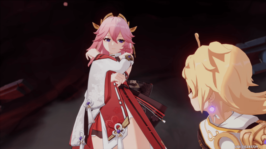 Продолжаем идти под размышления Паймон, пока не доберемся до главных ворот. Сопротивление уже вторглось в город и готово напасть на дворец. В этот момент в битву вмешается Райдэн и заберет путешественника в свой мир.