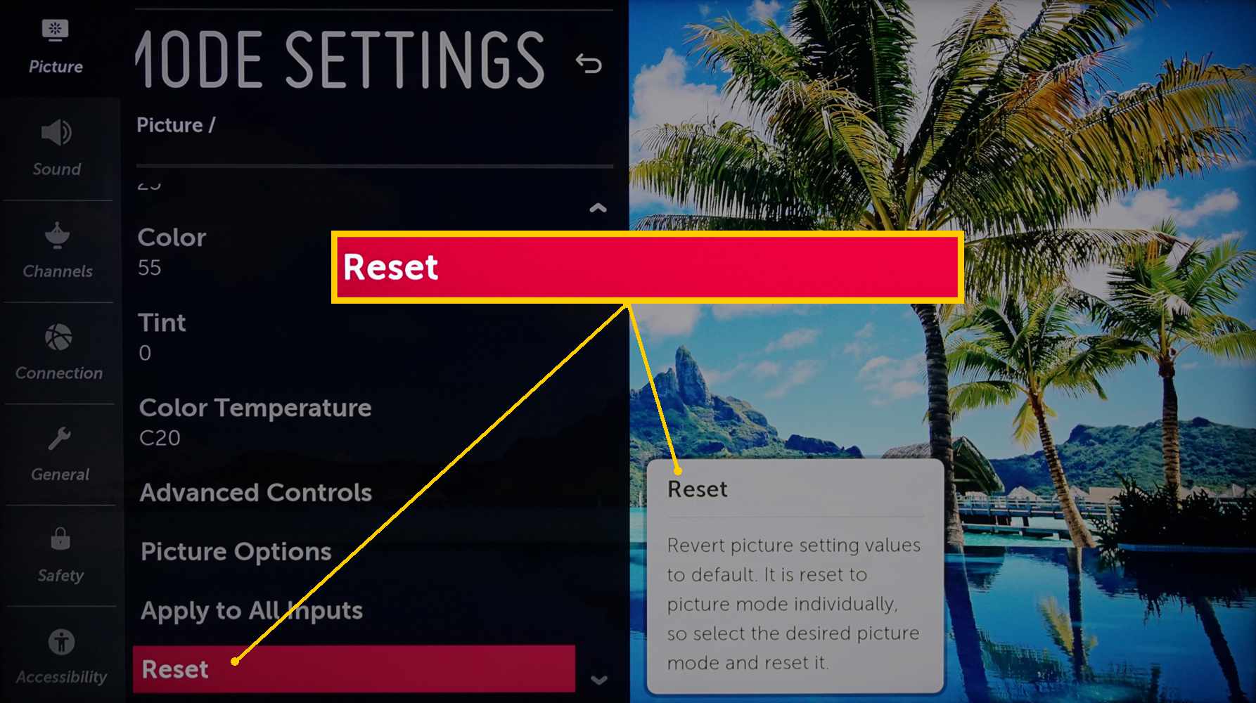 - Сбросить изображение. Задействуйте эту опцию, если после ваших настроек телевизор стал показывать хуже. Все характеристики вернутся к заводским параметрам.